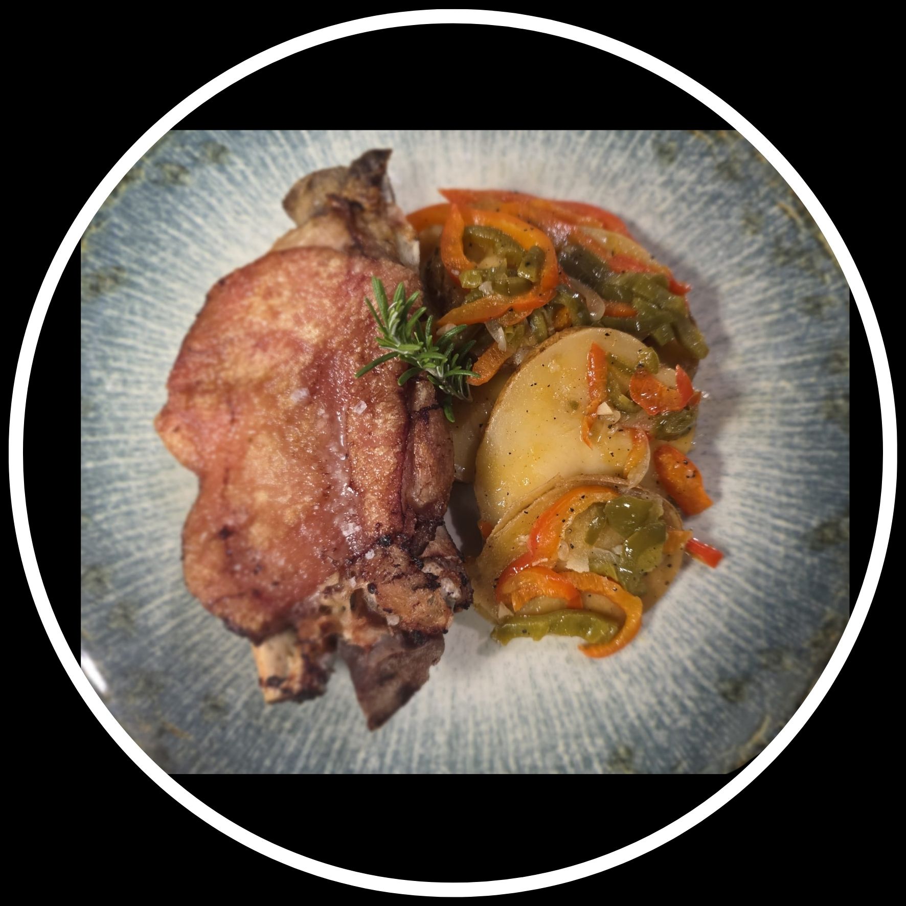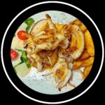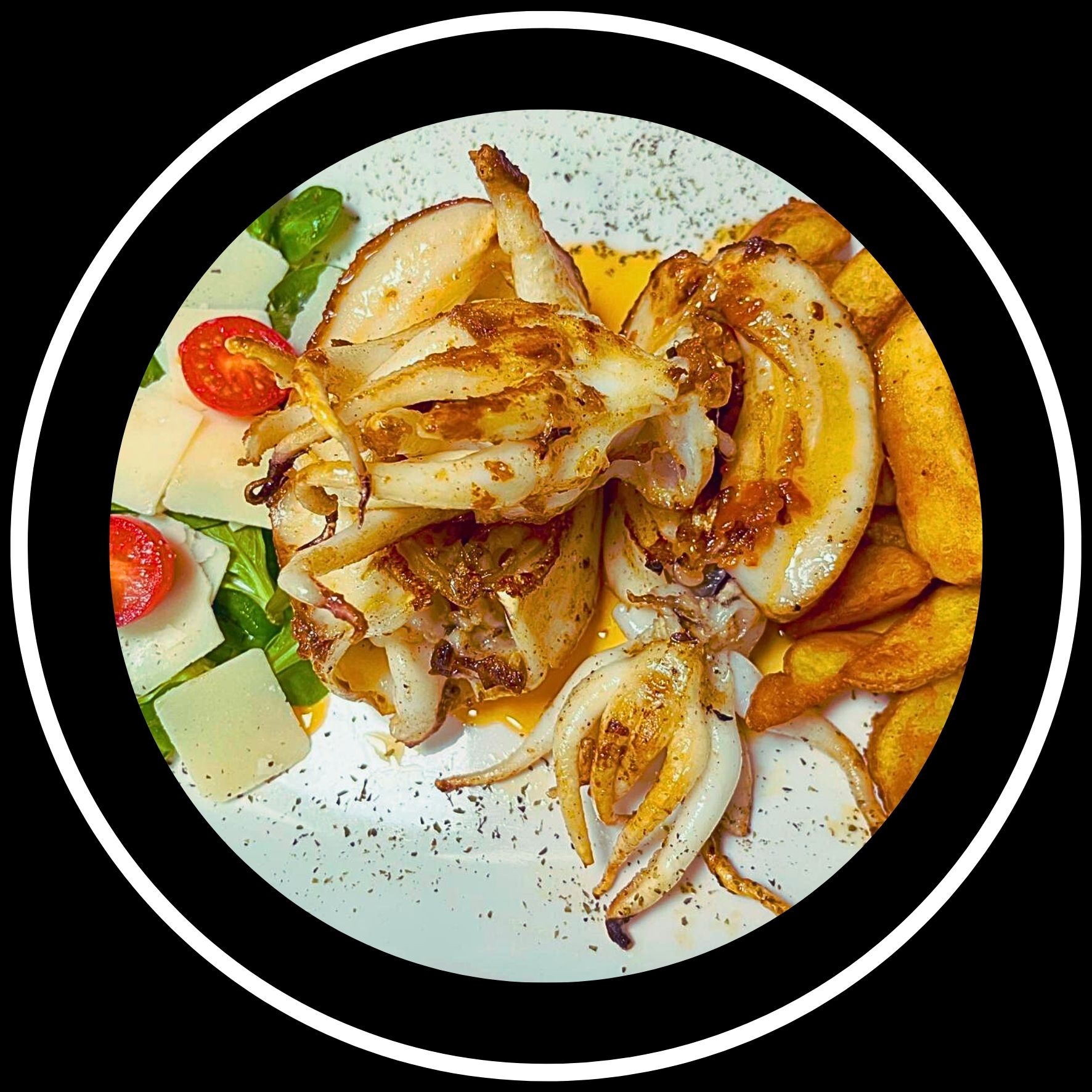 Sepia a la plancha, tomate seco y semiseco, patata panadera y ensalada